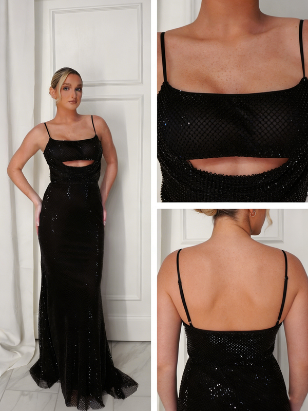 Spaghetti Straps Black Mermaid Sequin Backless Prom Dresses, OB108
